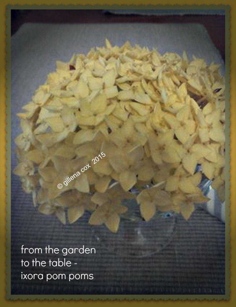 Ixoras - hardy, hearty blooms; in reds, yellows, oranges and pinks to dismiss every gloom; they decorate my garden; they love the rain; more and more pop up, in the splendor of a sunny day after it rains; like tiny umbrellas they cluster together, bunches to delight every admirer. So i pick some, bringing delight to my table.