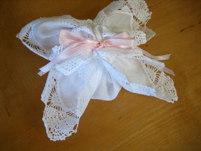 To her signature hanky hidden below,